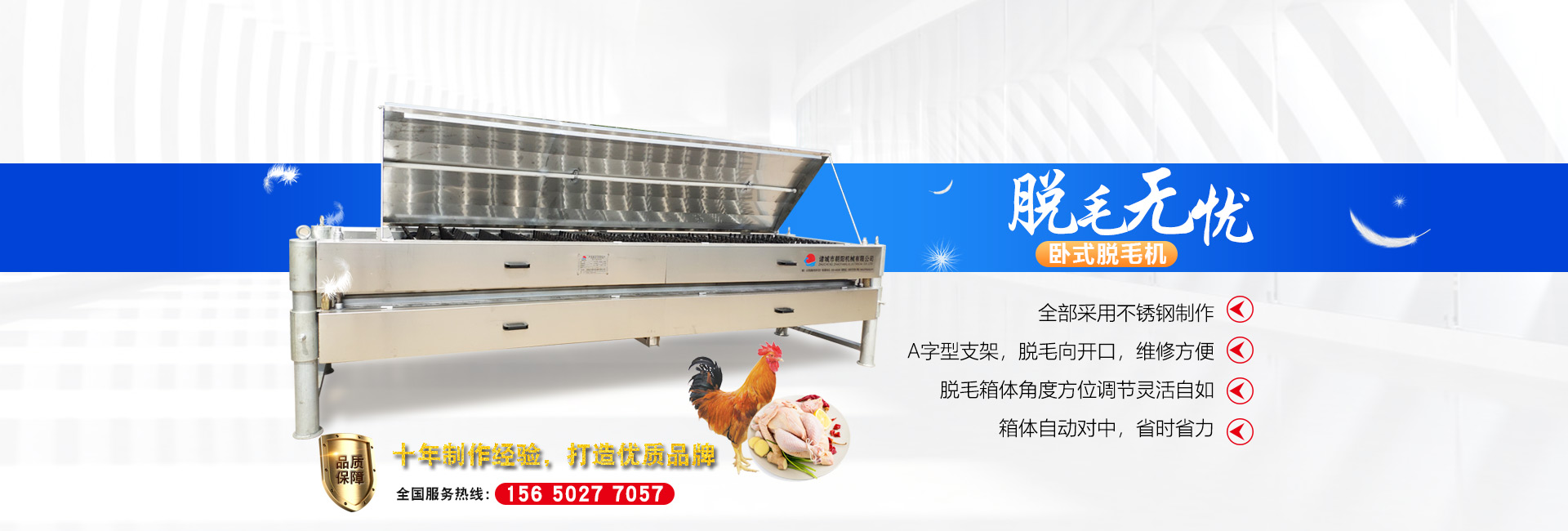 公司長(zhǎng)期與國(guó)內(nèi)外屠宰加工企業(yè)合作,走引進(jìn)——消化——?jiǎng)?chuàng)新和自主研發(fā)相結(jié)合的道路,在國(guó)內(nèi)外同類(lèi)產(chǎn)品的基礎(chǔ)上,不斷更新和改造。公司主要設(shè)備有:A字型立式脫毛機(jī)、臥式脫毛機(jī)、強(qiáng)力噴淋機(jī)、松毛機(jī)、浸燙池、螺旋預(yù)冷機(jī)、禽籠清洗機(jī)、電暈機(jī)、兔扯皮機(jī)、兔割前爪/后爪機(jī)、剝胗機(jī)、自動(dòng)洗鉤機(jī)、螺旋燙爪機(jī)、雞爪脫皮機(jī)、分割輸送帶等屠宰用設(shè)備。其中,公司獨(dú)力發(fā)明生產(chǎn)設(shè)計(jì)的“電動(dòng)調(diào)節(jié)脫毛機(jī)”及“自動(dòng)控水控溫浸燙池”順利通過(guò)知識(shí)產(chǎn)權(quán)局的實(shí)質(zhì)性審查。公司所生產(chǎn)的設(shè)備 可與國(guó)外同類(lèi)產(chǎn)品配套使用,設(shè)備遠(yuǎn)銷(xiāo)阿爾及利亞、澳大利亞等中東、非州等并建立了長(zhǎng)期穩(wěn)定的合作關(guān)系。